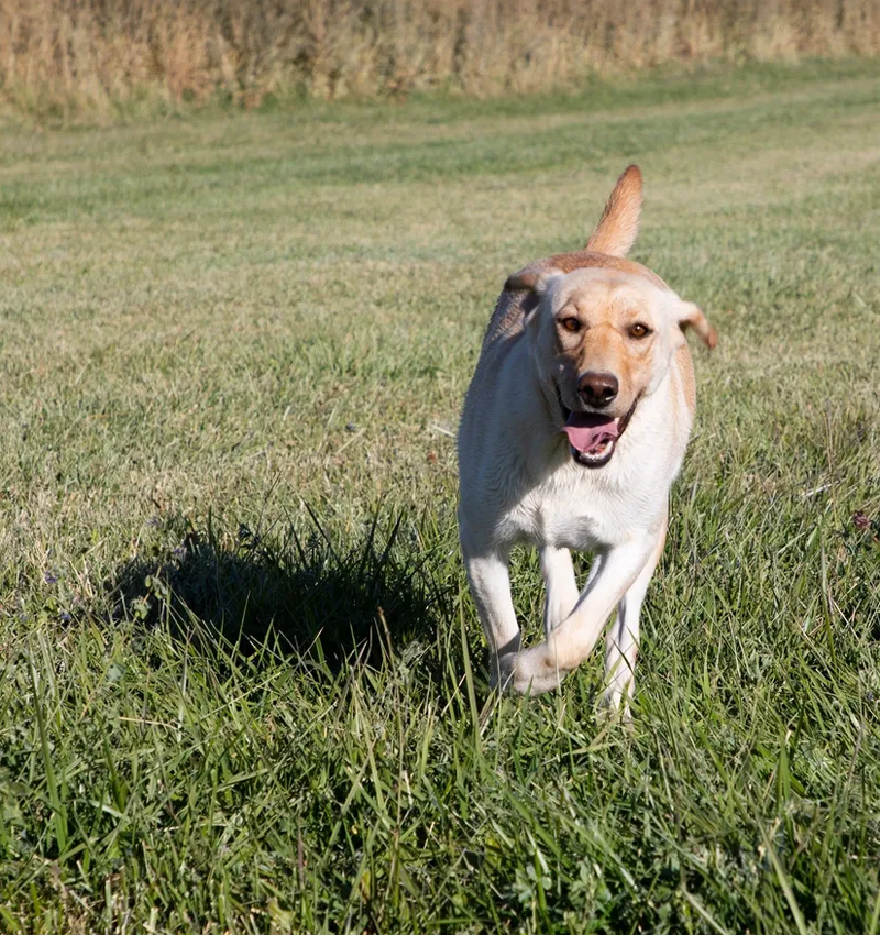 The grounds are covered with a mixture of open hayfields with edges of tall grass, willows, and thick cover. A small stream runs laterally through the property, interspersed by two ponds. It is an ideal place to raise Lab puppies. The farm features a state-of-the-art kennel with its own heating and A/C system and indoor/outdoor runs for the dogs. Gary and Doris walk the dogs off leash twice a day, every day, so they get lots of sunshine and exercise. A typical evening walk features a fun session at the pond throwing bumpers for the dogs to retrieve, with big splashes as they enter the water.